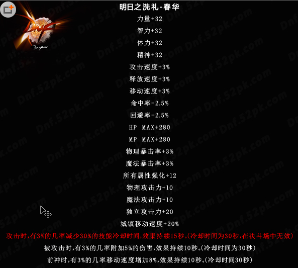 攻击时,有3%的几率减少30%的技能冷却时间,效果持续15S。(冷却时间为30S;在PKC无效)
