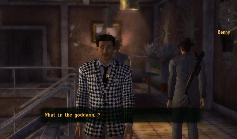 casino找元凶Benny。同时首领让你贿赂门口的NCR让他们离开,这需要500金币。