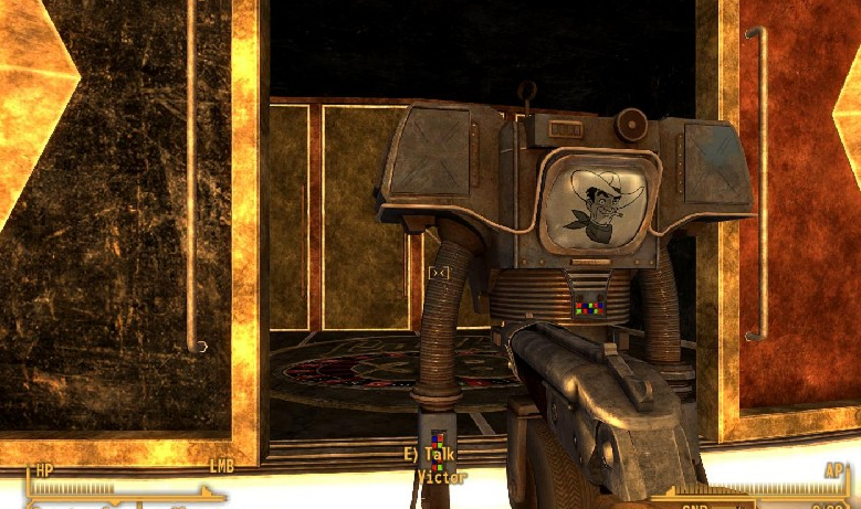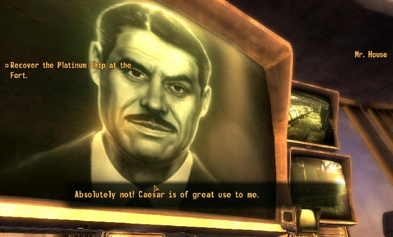 然后回复Caesar,他让你去杀掉Mr. House,但是主角只见过影像,需要给House做任务把他印出来。传送到The Strip去找Mr. House。与他对话后被传入地下室,可以拿到几把枪,在听完一段废话后被传回。