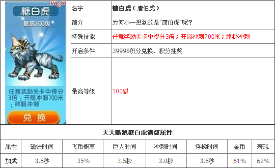 从这里我们可以稍微了解下天天酷跑糖白虎的基本技能和属性,从技能上看刷分好像很给力的说,冲刺也很给力。