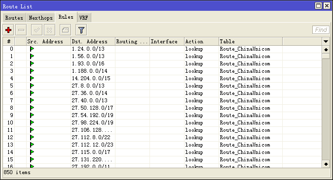 /ip route add gatewall="对应网关地址" check-gateway=ping routing-mark=telecom 或者Unicom如导入的网通线路标记为Route_ChinaUnicom,我们可以在ip route rules 里找到: