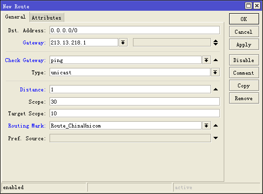 之后我们在ip route 中routing-mark 选择对应的Unicom 路由表