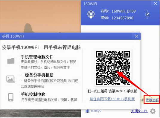 从官网下载160WiFi4.0Beta版,开启之后就能看到“我要尝鲜”160WiFi手机版,点击可通过扫描二维码或者前往官网下载160WiFi手机版。将160WiFi手机版下载安装到手机,开始体验之旅吧。