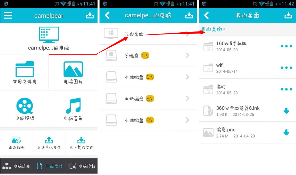 160WiFi手机版管理电脑文件的页面分为四个部分,常用文件夹、电脑图片、电脑视频和电脑音乐,无论你想管理哪个类型的文件,都可以实现。比如,小编点击“电脑图片”,添加电脑文件夹,就可以看到电脑上的所有文件,点击“我的桌面”,桌面上的图片文件或文件夹就会显示,点击下载,就可将电脑图片轻松下载到手机上来。电脑上的音乐或其他文件也可通过类似的操作很轻松的管理。