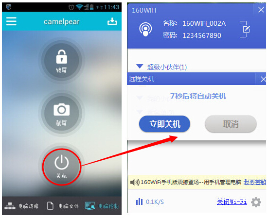 锁屏能够让电脑在10秒之内进入待机状态,截屏能够让整个电脑屏幕截图到手机。点击160WiFi手机端的关机按钮,电脑端的160WiFi会提示远程关机,并有10秒的倒计时。也可人工选择立即关机或者取消该操作。从此之后躺在被窝里都可以在10秒之内让电脑关机。