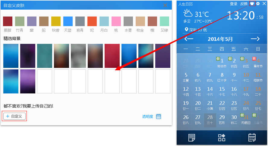打开人生日历4.0Beta版,全新的软件界面会让你眼前一亮。点击主窗口右上角换肤小图标,各种皮肤随你换。小清新、炫酷范儿,任何一款都能给你完全不一样的感觉。如果想突出自己的个性,选择自定义,你想要有的效果,人生日历4.0Beta版都能给你完美呈现。