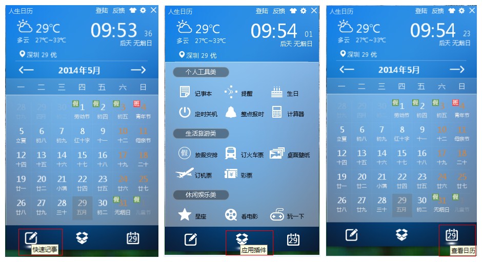 4.0Beta版沿袭了人生日历的精髓,并在此基础上力求让用户体验更加良好。日历主界面将人生日历的所有功能都融合在一起,用户想要使用任何一个功能,都不需要另开日历窗口。快速记事:点击之后能够快速记事,方便用户在突然需要记事之时,能够快速在人生日历主界面上找到记事入口并快速记事。应用插件:这是一个百宝箱,个人工具类、生活旅游类、休闲娱乐类,你想要的应用插件全部在这里完美呈现。查看日历:这个按钮有助于你在使用其他功能之后,快速方便的返回到日历主界面。