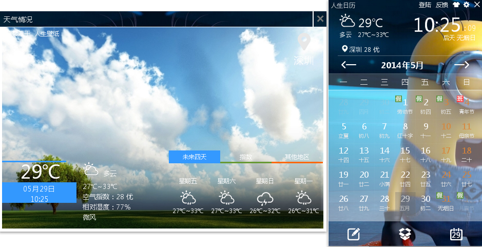 人生日历4.0Beta,UI设计更加重注用户体验,一切以用户为中心。三行天气预报让你能够快速得知实时天气和温度、温度区间、地理定位以及空气指数。点击天气小图标,未来4天天气情况、生活指数、其他地区天气预报也能清晰可见。人生日历4.0Beta天气预报功能给你不一样的查看体验。