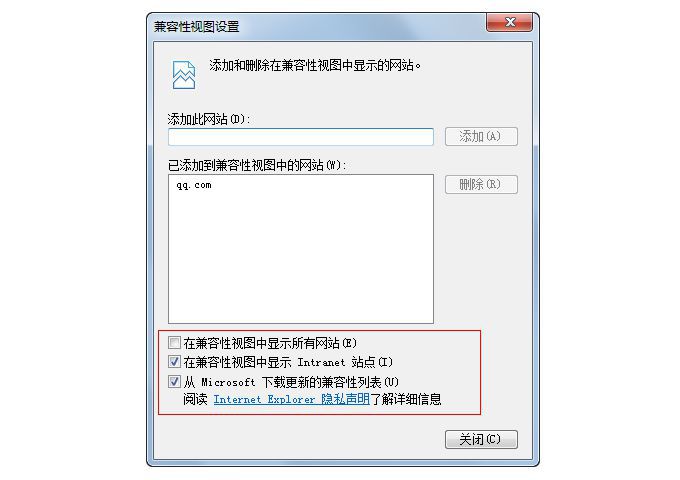 您可以选择对特定网站或内网网站启用或取消兼容性视图打开。