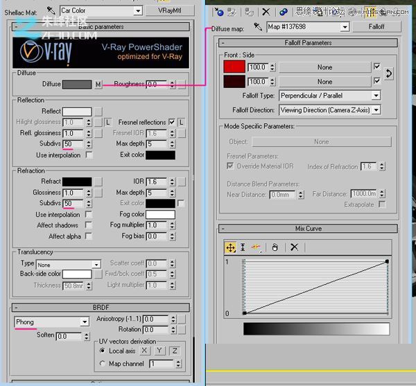 我们的现场准备工作完成后,让我们开始用的材质和纹理。“紫胶”材料分配到车身上。在“基地和虫漆”材质选项,使用“V??RayMtl”,并把“虫漆颜色混合”值“100”。回到基本材料,使用如下所示的设置。