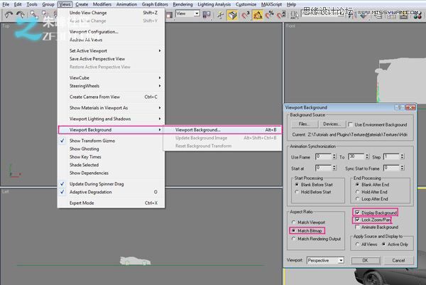 确保您的选择透视图,并进入到“查看”>“视口背景”>“视口背景”或者(Alt + B)。点击“文件”和加载背景图像。使用所选的设置而加载的背景图像。