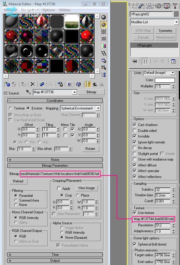 再次打开“材质编辑器”,然后拖动“使用纹理”的VrayLight插槽的HDRI。