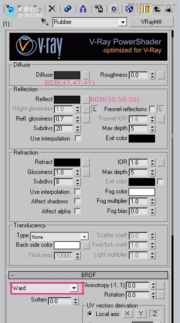 对于轮胎材料应用的VRayMtl和检查“BRDF”,“病区”。BRDF参数确定的重点和镜面反射的类型。