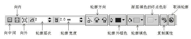 在“互动式轮廓图”工具的属性列中,如下图,可对轮廓进行层次、宽度等编辑。轮廓有三种方向:向中间、向内和向外。可以通过增减“数字框”内的数字编辑轮廓的层次数和宽度。还可通过外框色彩和填色色彩的下拉色板编辑轮廓的外框色和填充色,所设定的填充颜色为对象的起始色,用窗口右侧填充的是轮廓结束色,中间各层轮廓的颜色为对象起始色到轮廓结束的过渡色。