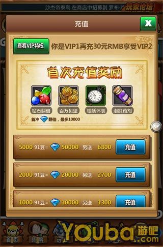 钻石可以说是梦想海贼王里最重要的,可是商店里面唯一通用的东西。商店里的船员招募(百万悬赏10钻、千万悬赏100钻、亿万悬赏300钻)、道具的购买、VIP礼包的购买都得用到钻石。而且远航副本的BOSS关卡也可以通过钻石刷新次数限制(要求达到VIP3)。当然小编身为琵琶网的小小编辑,同在非R行列,这个就不考虑了,毕竟VIP2升到VIP3需要充42块大洋啊。