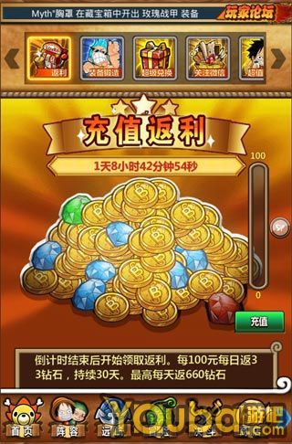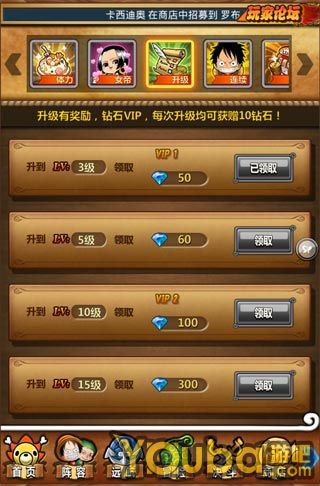 玩家钻石的来源一般是升级系统送的(10钻/每级);冒险里的升级奖励(3级50钻、5级60钻、10级100钻、15级300钻);在领取这些钻石的时候可别忘了还有个财神到的活动,这可是稳挣不赔的活动,第一次28钻、第二次280钻、依次10倍递增。这样算的话,梦想海贼王的奖励加上财神到活动,玩家在10级的时候就能拥有400左右的钻了。这些钻可不能急着去首抽A卡。因为11级的时候会有一把B级武器(黄金棍)需要298钻,这可是艾尼路的配缘武器,运气好的话领15级300钻后,首抽A卡再来个艾尼路那就更好了。