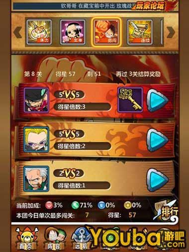 这是玩家获得钻石的主要途径,也是小R中R们逆袭大R的关键之地。游戏11级后开启勇闯功能,玩家可以一路挑战各种阵容直到战败的一刻,战胜的关数越多,所的的奖励就越好,并且系统会根据玩家闯过的关数,进行排名,排名前20的玩家都可以获得钻石奖励。