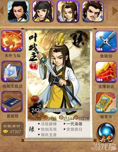 用最少的丹将潜力消耗完毕或者干脆就一点丹都不浪费就是不培养!然后开防御缘分带2本防御书去4,5,6位置当1招秒杀的角色!到了后期当你的剑神组郭家或者杨家培育完毕后那么我们最后来培养这位大神!主防副内一般郭家达到1万防御都在200级以上,我们的叶孤城只需要200级控制内力6000左右其他的都堆防御!绝对秒杀任何高防菜刀!而能斩杀此叶的!