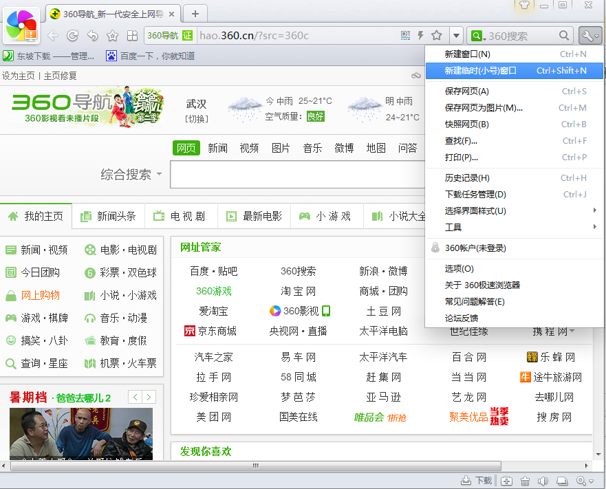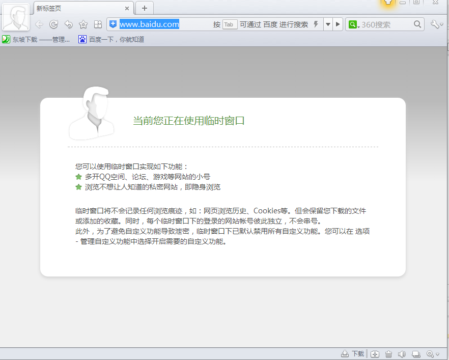 在这个发展越来越快的网络世界中,一些隐私或多或少都会有所曝光。为了我们的隐私不被曝光,我们可以使用360临时窗口。使用临时窗口可以实现如下功能:多开QQ空间、论坛、游戏等网站的小号、浏览不想让人知道的私密网站,即隐身浏览。