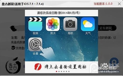 第三步:请根据【盘古】越狱工具提示“修改iOS设备系统日期为:2014年06月02日前”