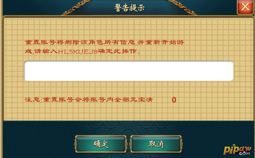 3.点击一下重置账号,然后会看到一个新界面:重置账号将删除该角色所有信息,并重新开始游戏,请输入验证码确定此操作(注意重置账号会将账号内元宝清0);
