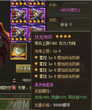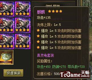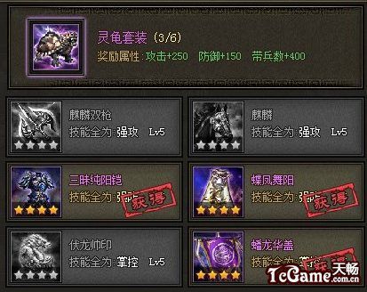 2、灵龟套装:等级:106点券:18000属性:攻击+250防御+150带兵数+400装备要求:麒麟双枪:强攻麒麟:强攻三味纯阳铠:强防蝶凤舞阳:强防伏龙帅印:掌控蟠龙华盖:掌控