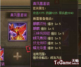 3、真·凤凰套装:等级:120点券:25000属性:攻击+375防御+225带兵数:840装备要求:凤凰+朱雀