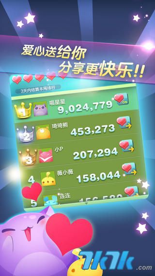 游戏中的动物不仅可以排成一条直线哦,如果你足够熟练,还可以尝试把小动物们排成“L形”或“T形”进行消除,分数加倍的快乐值得你去尝试。