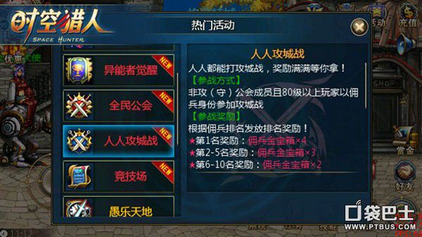 空前规模的时空猎人攻城战新玩法上线,全民参军,举国攻城!现在只要满80等级,玩家即可以“佣兵”身份参与攻城战,再无公会、战力等限制,让你体验战争中身先士卒的豪迈感,赢得丰厚佣兵奖赏!