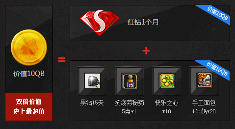 2、活动期间玩家开通或续费1个月红钻即可获得: 黑钻15天、抗疲劳秘药5点*1、快乐之心*10、手工面包*20、赫顿玛尔牛奶*20每个QQ号仅可领取1个超值礼包。
