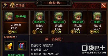 堕落泰坦初始进入竞技场界面,系统随机挑选与玩家等级相近的3名玩家以及第1名的玩家显示出来。挑战名次比自己高的玩家,如果胜利则双方位置对调,替换高名次的玩家;挑战名次比自己低的玩家,如果胜利则位置不变。挑战失败则双方位置不变。玩家当日竞技次数是有限制的,每日免费10次!