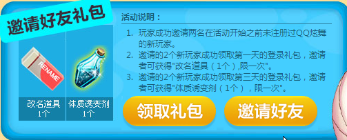 玩家成功邀请两名在活动开始之前未注册过QQ炫舞的新朋友,并这两位新朋友成功领取第一天的登录礼包,邀请者可获得改名道具1个。 所邀请的2个新朋友成功领取第三天的登录礼包,邀请者可获得体质诱变剂1个。 每份奖励仅限领一次。