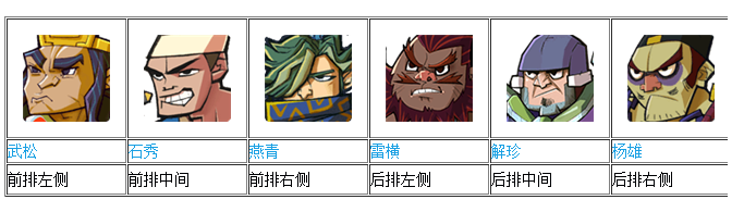 最后一个位置放杨雄,杨雄在这个阵容中的作用也很大,他的技能和李逵的一样,但是伤害要差一点,在武松没有积累起攻击力的时候,杨雄就是核心的输出。不过他的技能有副作用,因此不能放在中间,放在6号位的话,只有解珍会收到伤害,雷横技能发动的时候就补满了,影响不大。