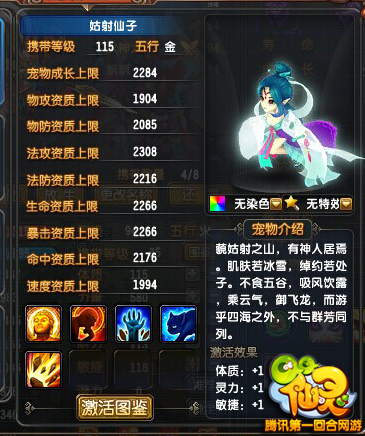 全新降临在《QQ仙灵》的宠物“姑射仙子”,携带等级为115级,物攻1904、物防2085、法功2308、法防2216、生命2266、暴击2266、命中2176、速度1994,更高概率自带5技能,一旦拥有无疑能在战场所向披靡。值得注意的是,玩家一旦激活效果,还能额外对体质、灵力、敏捷、力量、耐力5大属性各加1点。当然,姑射仙子也拥有各种染色方案,供玩家打扮出专属仙女。