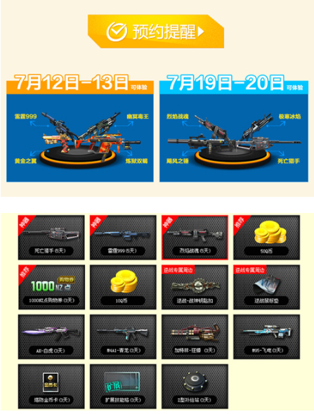 包括雷霆999、 幽冥毒王、黄金之翼、炼狱双蝎、烈焰战魂、极寒冰焰、飓风之锤、死亡猎手等在内多款极品道具,将在周年狂欢之际,免费送与广大玩家,在7月12、13日 19、20日这四天的时间里,逆战游戏商城将开启长达4天的全免费活动,其中还包括逆战的极品永久枪的获取活动,各位《逆战》玩家要即刻预约提醒,以免措施良机。