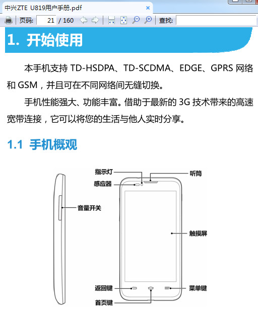 中兴ZTE U819是一款4.5英寸屏幕的3G手机,Android OS 4.1操作系统,四核处理器,双卡,支持GPS导航,A-GPS技术,蓝牙,后置500万像素摄像头。以下文档是中兴ZTE U819使用说明书,有需要的朋友可立即下载此文档。