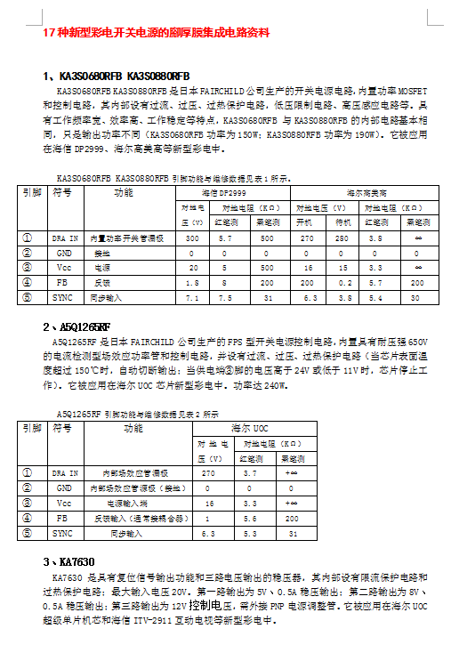 这里分享的是17种新型彩电开关电源脚厚膜集成电路资料,KA3S0680RFB KA3S0880RFB、KA7630、MC44608、STR-F6456、KA5Q1565RF等开关电源控制电路,doc格式文档,大家可以进行免费下载这份资料。
