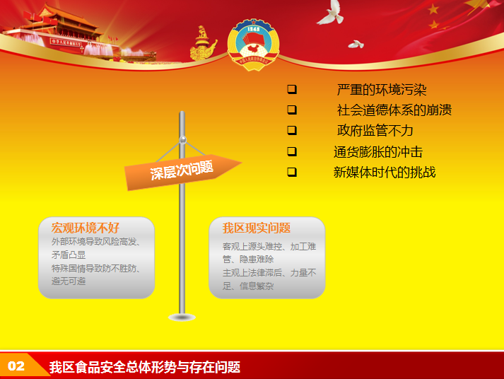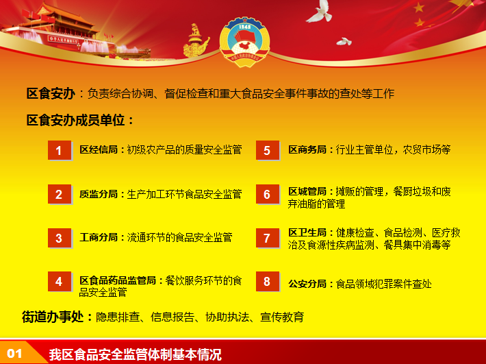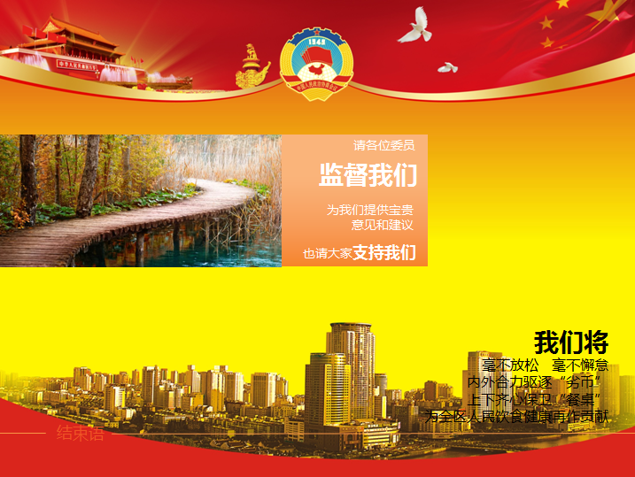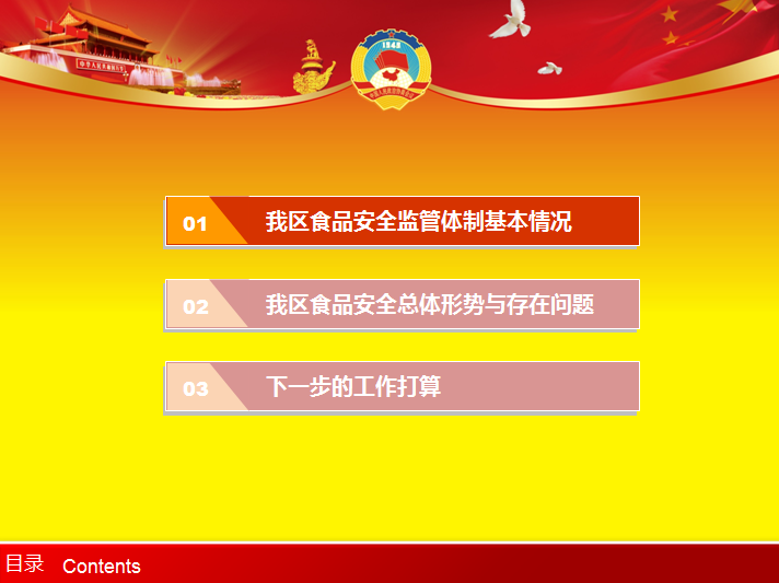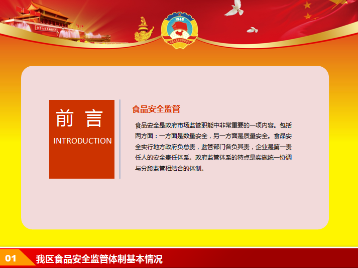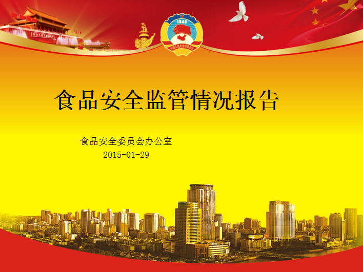这里分享2015食品安全年终工作总结ppt模板,以红色和黄色为背景基调,包含天安门,城市元素,适合政府机关,食品安全等工作汇报ppt,动态ppt文件免费下载。