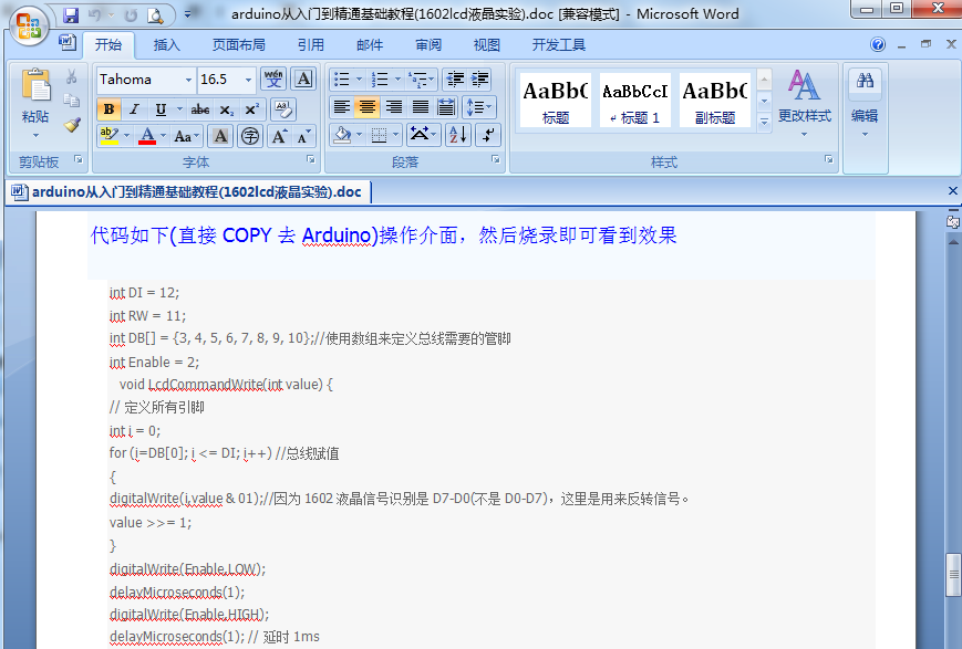 今天小编和大家分享的是一个arduino教程,具体为arduino从入门到精通基础教程(1602lcd液晶实验),为doc格式,希望这个arduino入门教程对大家有所帮助,有需要的朋友可立即下载此文档。