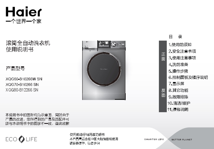 海尔xqg80 b12266sn是水晶系列的一款滚筒洗衣机,可洗8公斤衣物,采用USP不间断速洗,S-D plus芯变频电机,这里带来的是海尔xqg80 b12266sn滚筒洗衣机使用说明书,pdf格式海尔xqg80 b12266sn说明书免费下载。