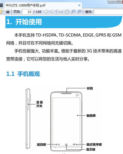 中兴ZTE U889是一款5英寸3G手机,Android OS 4.2操作系统,四核处理器,后置500万像素摄像头,支持GPS导航,A-GPS技术,蓝牙。以下文档是中兴ZTE U889使用说明书,有需要的朋友可立即下载此文档。