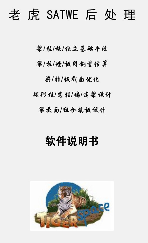 该老虎SATWE后处理软件使用说明书主要从梁/柱/板/独立基础平法、梁/柱/墙/板用钢量估算、梁/柱/板截面优化、矩形柱/圆柱/墙/连梁设计、梁截面/组合楼板设计五个方面进行说明,内容完整详细,共由127页组成,如果你需要一份这样的satwe用户手册或satwe说明书,点击本文下方相应的下载地址进行下载查阅即可!