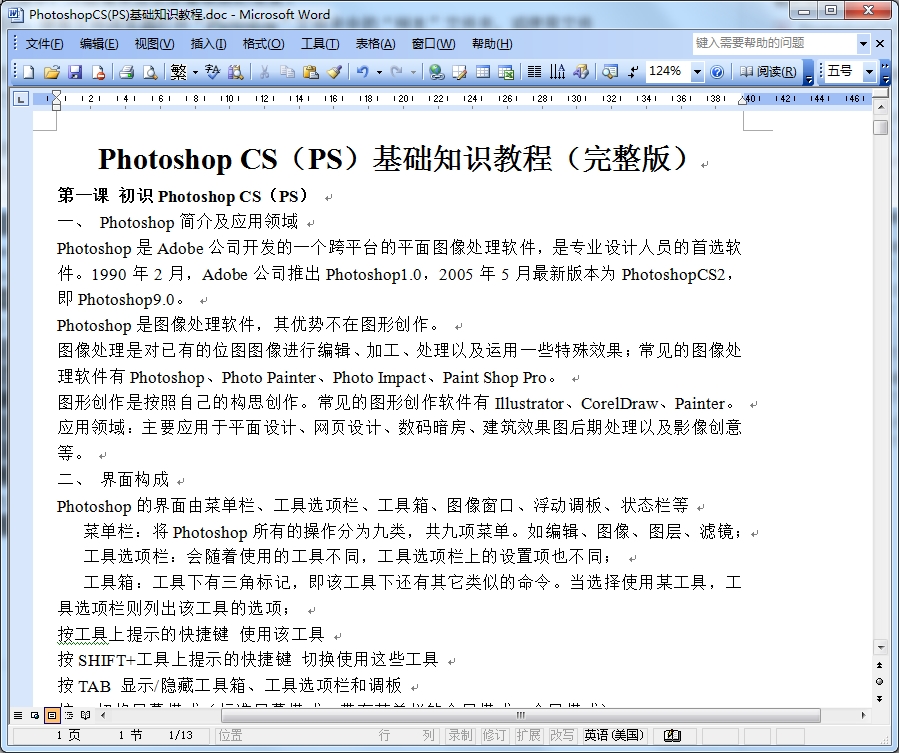 这里分享的是Photoshop CS(PS)基础知识教程,这份ps教程详细介绍了ps工具的使用方法以及一些常用到的ps快捷键的使用方法,需要的同学朋友们赶紧下载学习吧。
