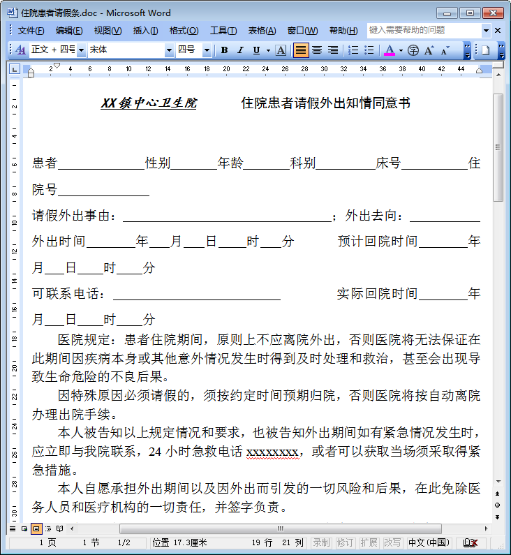 住院病人外出请假条内容截图