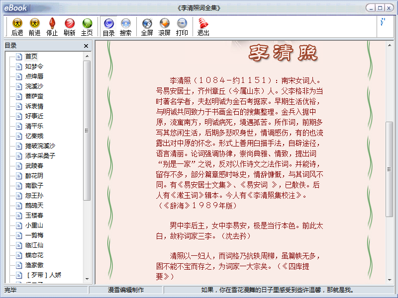 1、打开李清照词全集.exe文件,首页为李清照人物简介