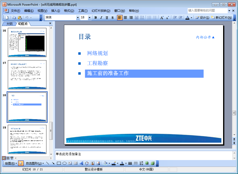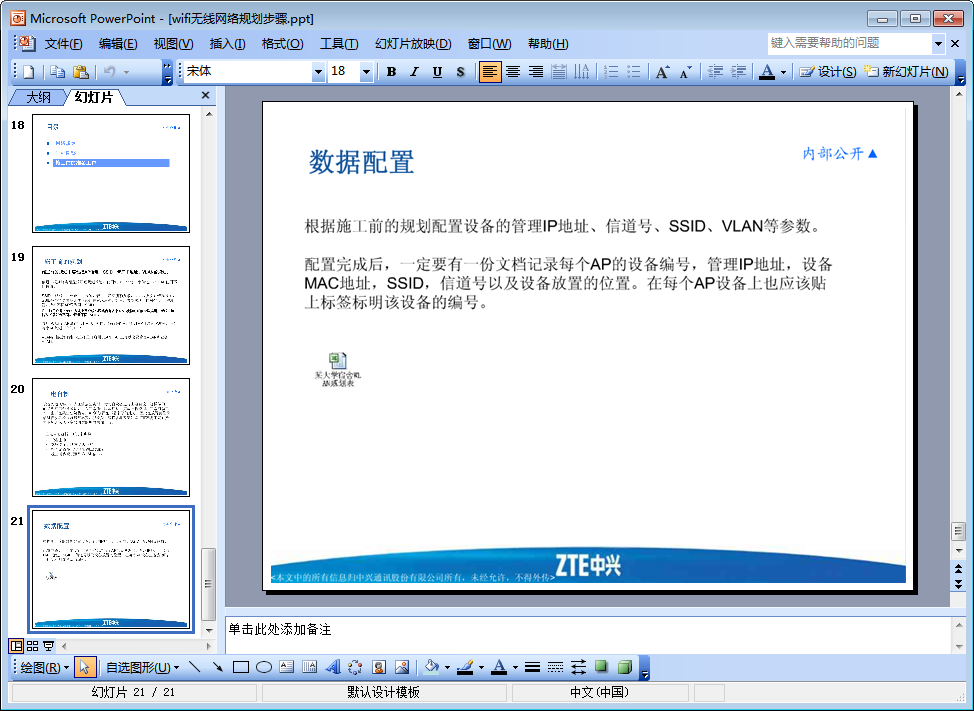 本节内容小编为大家精选带来的是一份wifi教学ppt,该ppt由中兴出品,ppt围绕网络规划、工程勘察、施工前的准备工作三方面展开,共由21页组成,如果你想了解更多wifi无线网络规划步骤,那么该ppt将会是你的不二之选。