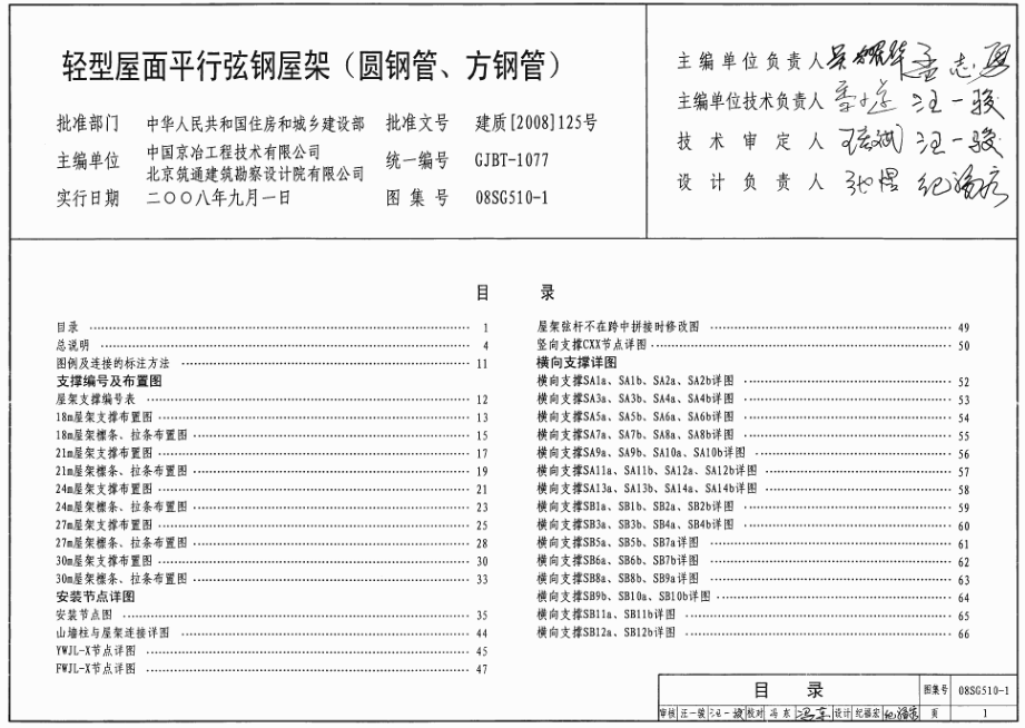 本图集适用于非地震区及抗震设防烈度≤9度的地区、跨度在18~30m、屋面采用压型钢板、夹芯板或发泡水泥复合板、截面为圆钢管、方钢管的平行弦钢屋架。屋架下弦标高≤20m;起重机工作级别A1~A5,额定起重量≤50t;桁架间距及柱距为6.0m、7.5m、9.0m的单层工业与民用建筑。内容包括屋架详图、支撑布置及其构件详图、檩条和拉条的布置、檩托位置图(檩条选用详见标准图《钢檩条、钢墙梁》)、安装节点详图(包括多跨单坡和多跨双坡的安装详图)等,便于设计、施工人员选用。