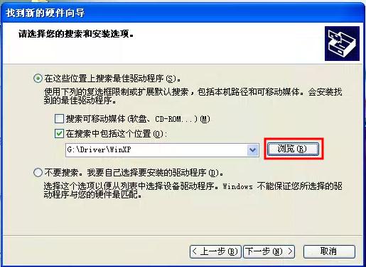 2.点下一步,去掉搜索可移动媒体,然后点浏览指定驱动的搜索位置,(如下图)