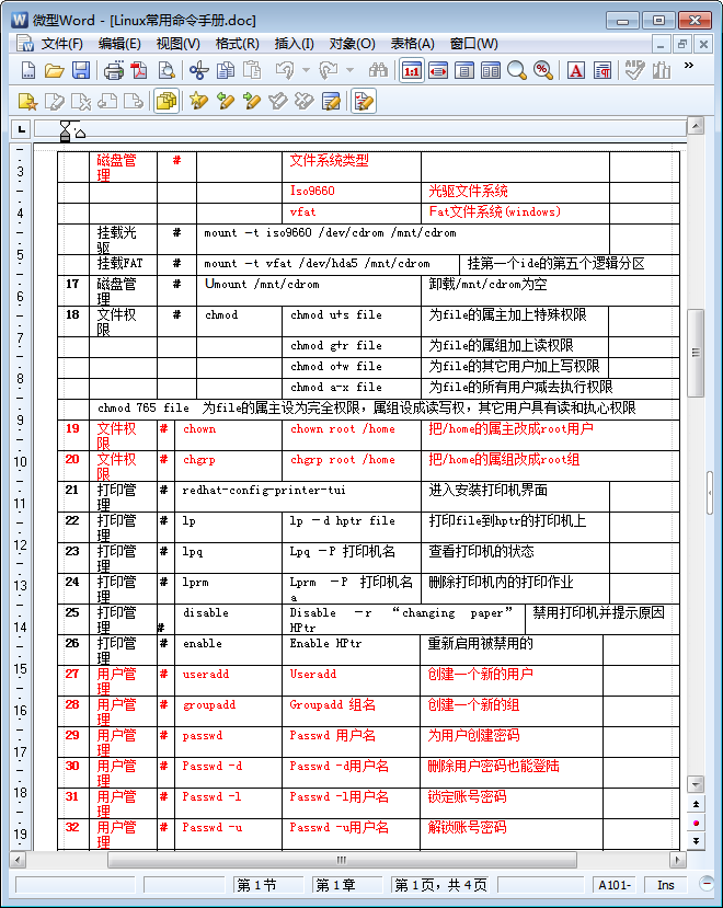 在本节内容中,东坡小编为大家整理带来的是一份word免费完整版Linux常用命令手册,该word版linux命令手册共有4页,手册详细且完整的列出了linux常用命令,方便有需要的朋友快速进行查询使用,需要这份linux常用命令手册进行打印使用的朋友们点击本文相应的下载地址进行下载即可!