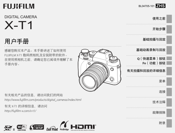 该Fujifilm富士xt1用户使用手册为pdf格式高清电子版,共由152页组成(以下简称为富士xt1说明书)。该富士xt1说明书详细介绍了富士xt1的使用方法及使用注意事项等,如果你想要对富士xt1有更多地了解或许需要掌握更过关于富士xt1的操作方法,那么不妨把这份富士xt1说明书下载下来看看吧!